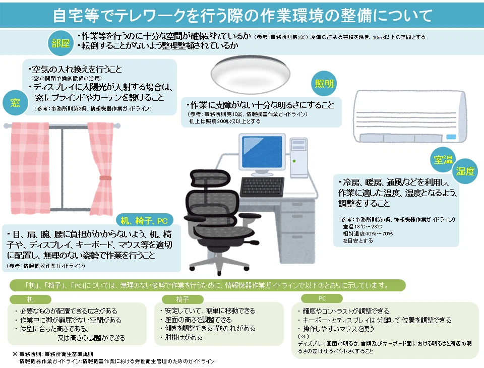 実は、会社で作業をする際は「情報機器作業における労働衛生管理のためのガイドライン」が定められているため、照明やデスクなど、作業環境が最低限整えられています。一方テレワークでは、先に述べたように、家にあるもので対応するため、デスクや椅子が不適切な高さや角度で使用されていることがあります。この状況を打破するために、厚生労働省から自宅等でテレワークを行う際の作業環境整備という通達も出ています。