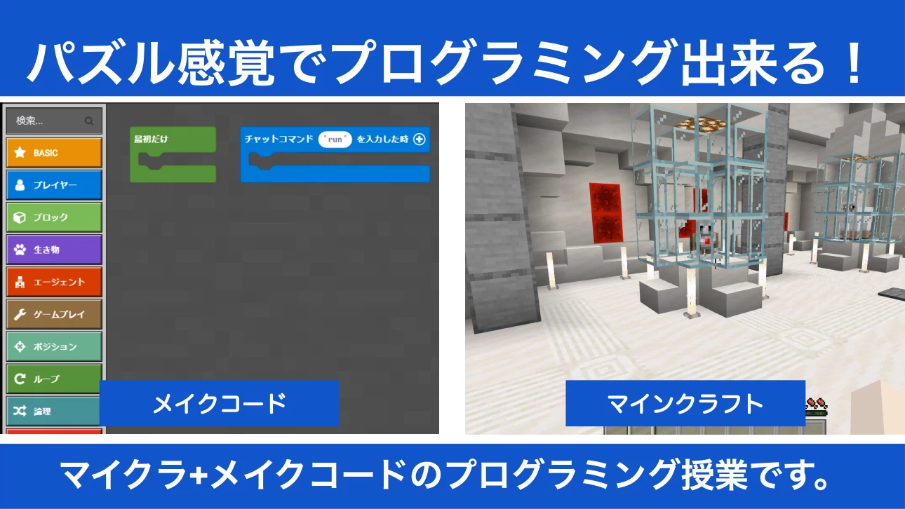内容:マイクラで学ぶプログラミング教室の「コードアドベンチャー」が、夏の短期集中授業を開催!!ユーチューバー「いぬたぬき」の解説する動画を見ながら、マインクラフトの中で問題を解いてプログラミングを学びます。「メイクコード」と言う視覚的にプログラミングすることが出来る機能を使って、プログラミングを行うので小学生低学年のお子様でもプログラムを組むことが出来ます。
